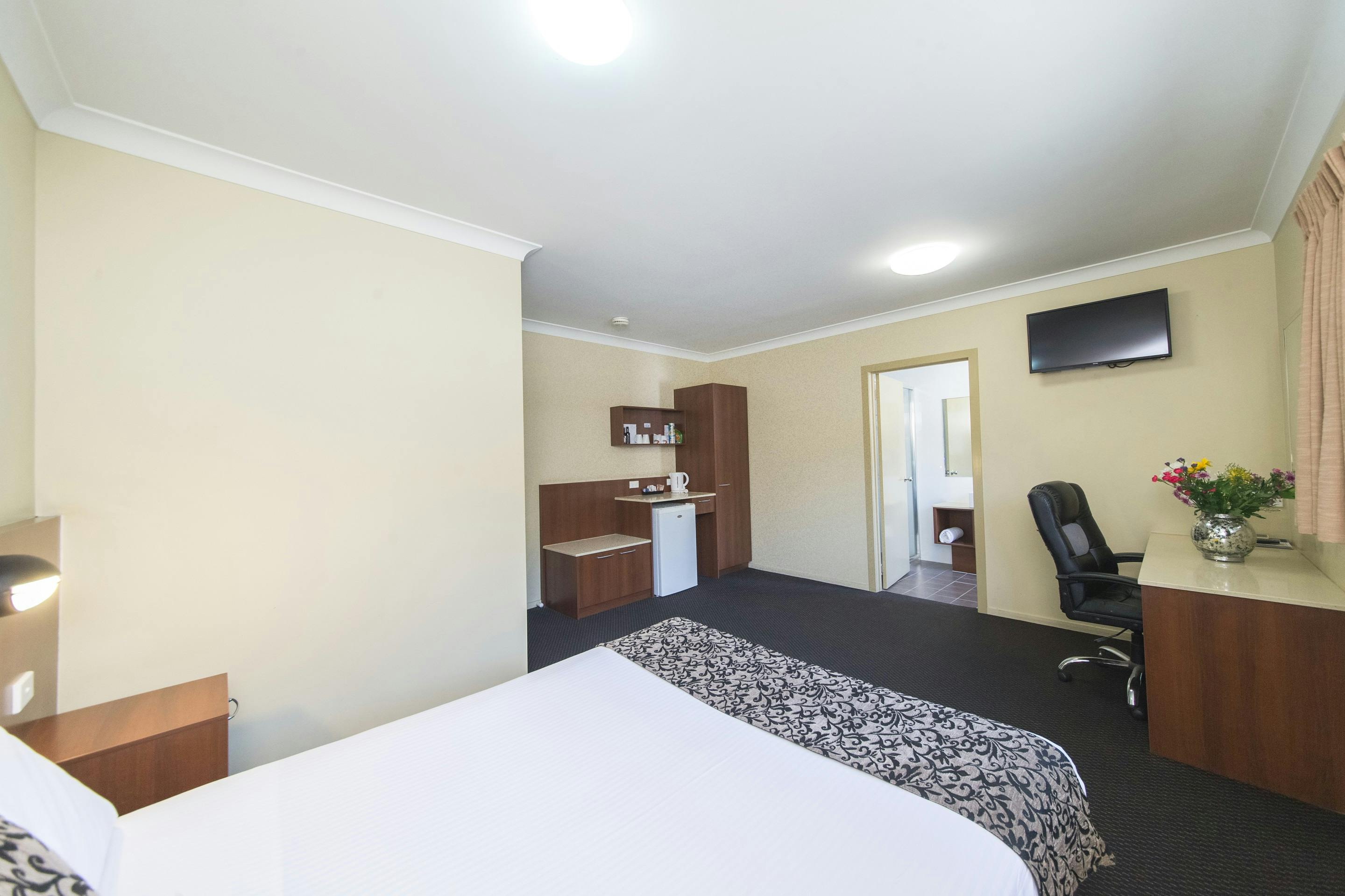 Our open plan Studio Room comes with a comfortable Queen Bed and en suite bathroom with walk in shower.